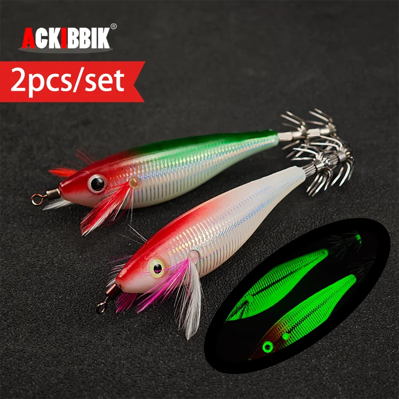 Ackibbik 2pcs/set 10cm Glow Shrimp Squid Fishhook Luminous Horizontal Squid Jig Hook Saltwater Cuttlefish Fishing Accessories $3.90
