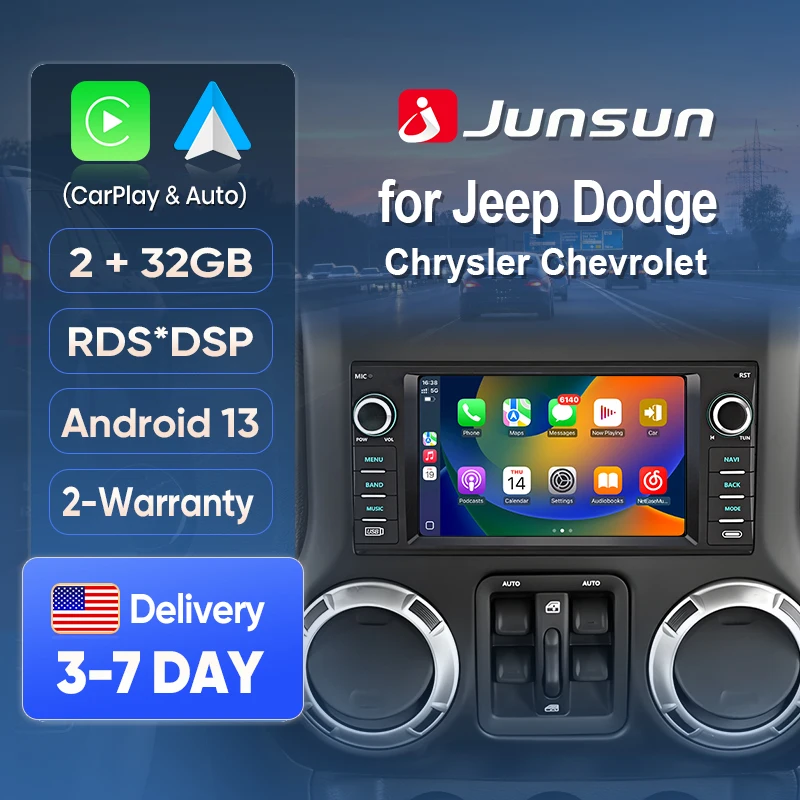 Junsun AI Voice Car Stereo Radio Wireless CarPlay For Apple Android Auto For Jeep Wrangler Dodge Grand Cherokee Chrysler BT GPS $107.51