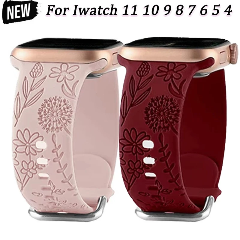 Silicone Bracelet For Apple Watch 11 10 46mm 42mm 9-8-7-6-5-4-3-2 Engraved Floral For IWatch Ultra 3 49mm 45mm-44-42-41-40-38mm $2.99