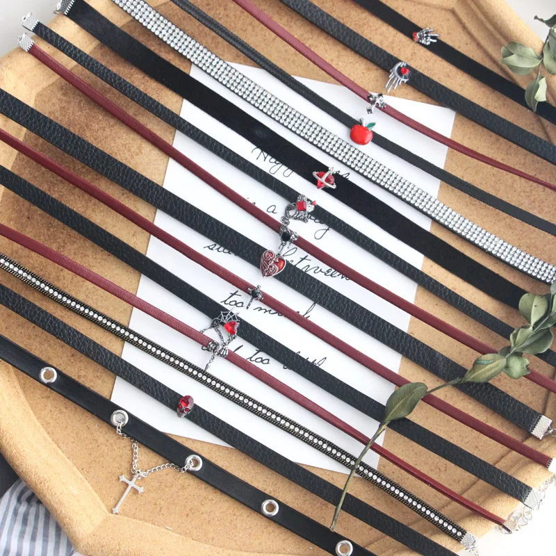 Vintage Leather Choker Necklace for Women - Skeleton Red Heart Cross Moon Apple Design Clavicle Jewelry Accessory for Ladies $1.32