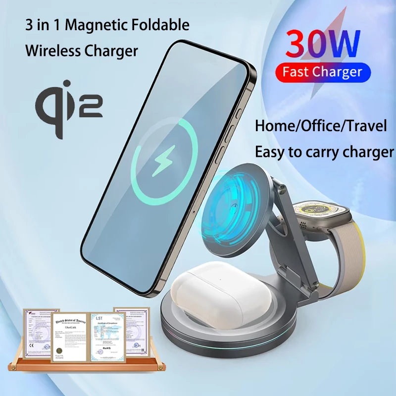 Portable 3-in-1 Foldable Magnetic Wireless Charger for iPhone Samsung Fast 30W PD Charging Station with 360 Degree Rotation $29.51