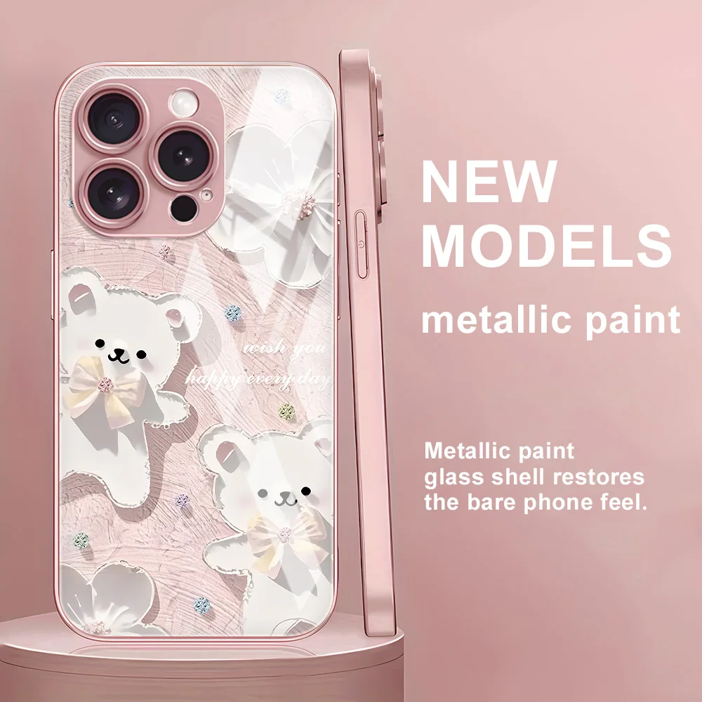 Tempered Glass Phone Case For iPhone 11 17 Pro Max Air 13 16 16E 15 14 12 16promax 15promax 17promax Bear Painted Funda Cover $4.19