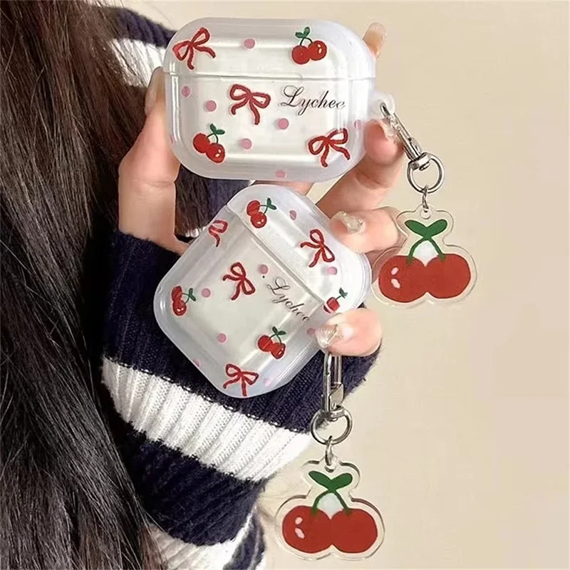 Sweet Bowknot Cherry Earphone Case For Apple Airpods 4 3 2 1 Pro 2 1 Cover With Cherry Lanyard Silicone Earphone Protective Case $4.78
