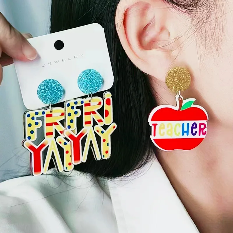 Teacher's Day Earrings Love Pencil Book Blackboard Shiny Acrylic Earrings Letter Apple Rainbow Notebook Student Teacher Earrings $1.28