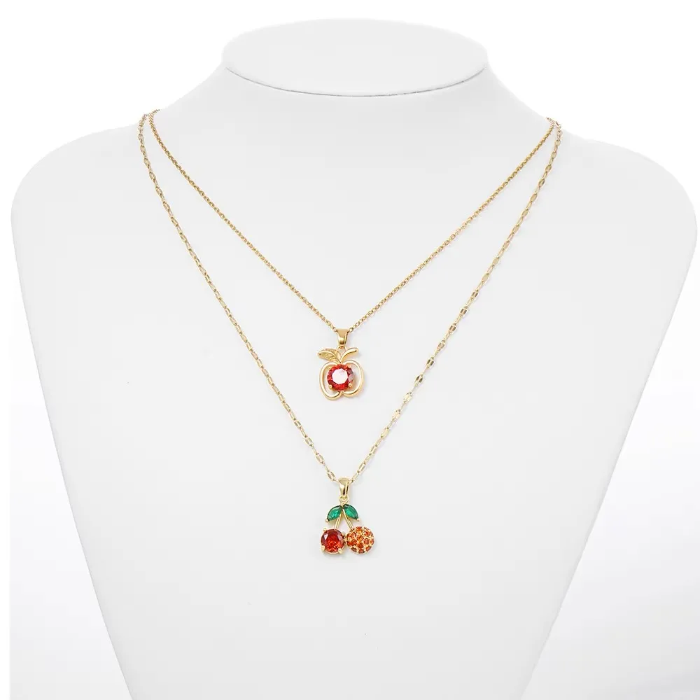 Colorful Zircon Cherry and Apple Pendant Necklaces for Women Girls Stainless Steel Trendy Romantic Jewelry Accessories Gifts $10.32