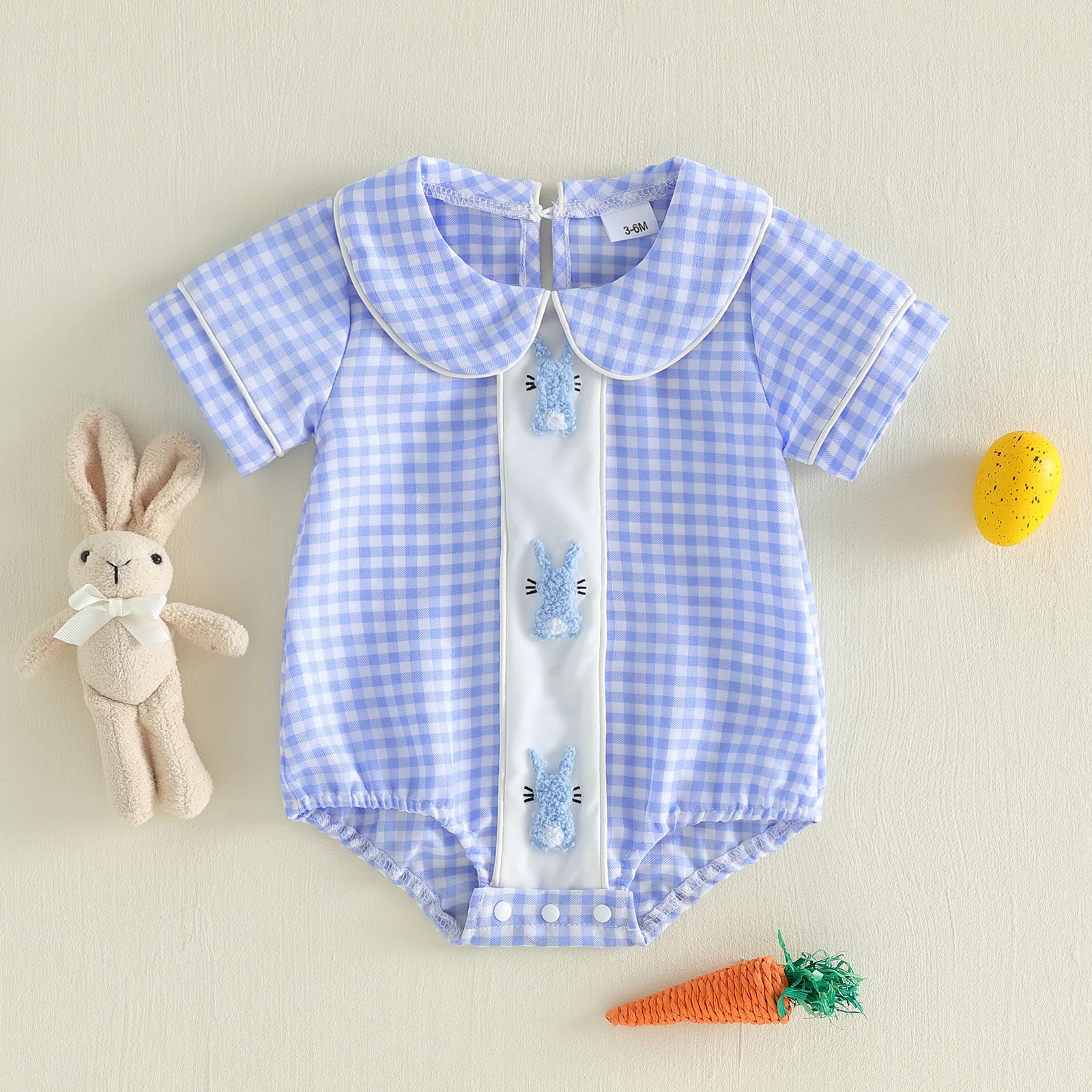 Infant Easter Bunny Romper with Short Sleeves and Doll Collar Adorable Embroidered Bodysuit for Newborn Boys Cute Playsuit $13.50