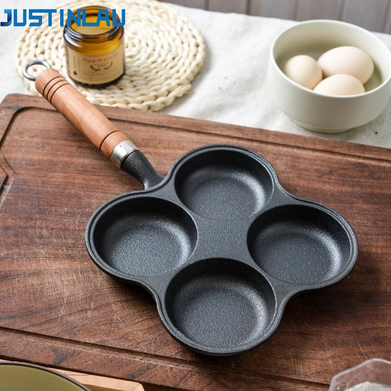 JUSTINLAU 2/4-Hole Cast Iron Omelette Pot Household Non-stick Flats-bottomed Egg Dumpling Pot Breakfast Egg Burger Frying Pan $22.41