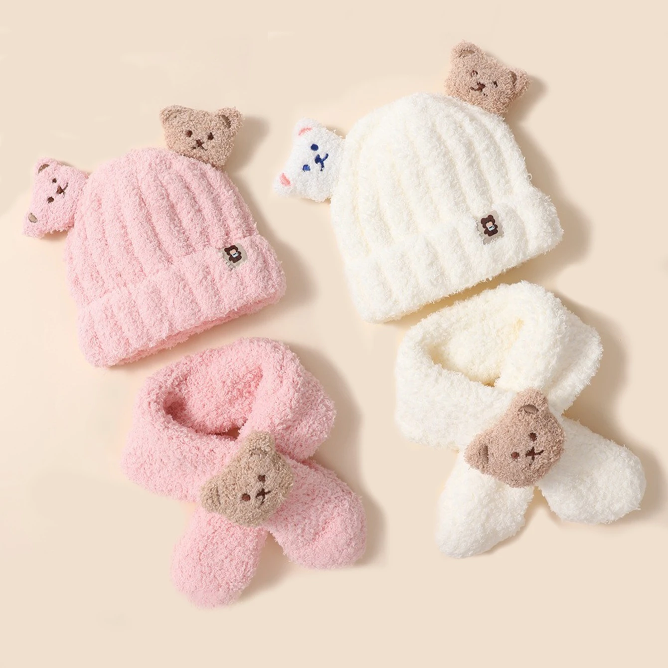 Warm Baby Hat and Scarf Set Cute Bear Thickened Winter Hat for Boys and Girls Windproof Fleece Newborn Photography Accessories $6.09