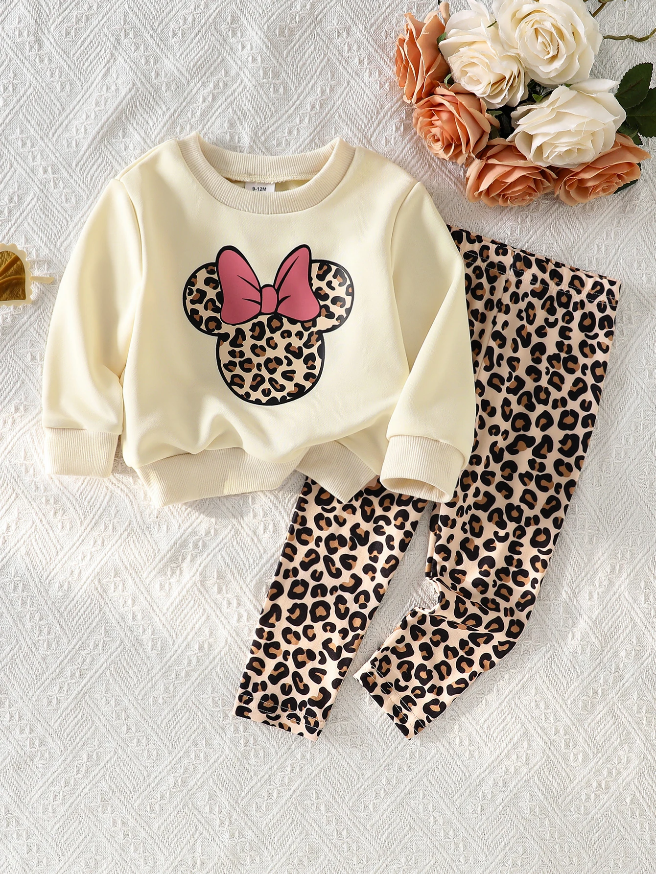 【Officially Licensed】Disney Minnie Mouse 2-Piece Spring and Autumn Baby Girl Pants Set Cartoon Leopard Print Minnie Head Print Crew Neck Sweatshirt + Elastic Waist Leopard Print All-Over Print Straight-Leg Slightly Stretchy Pants Children's Daily Home Outdoor Casual Skin-Friendly Versatile Clothing Girls' Fashionable Energetic Playful Cute Outfit Holiday Gift Choice $15.70