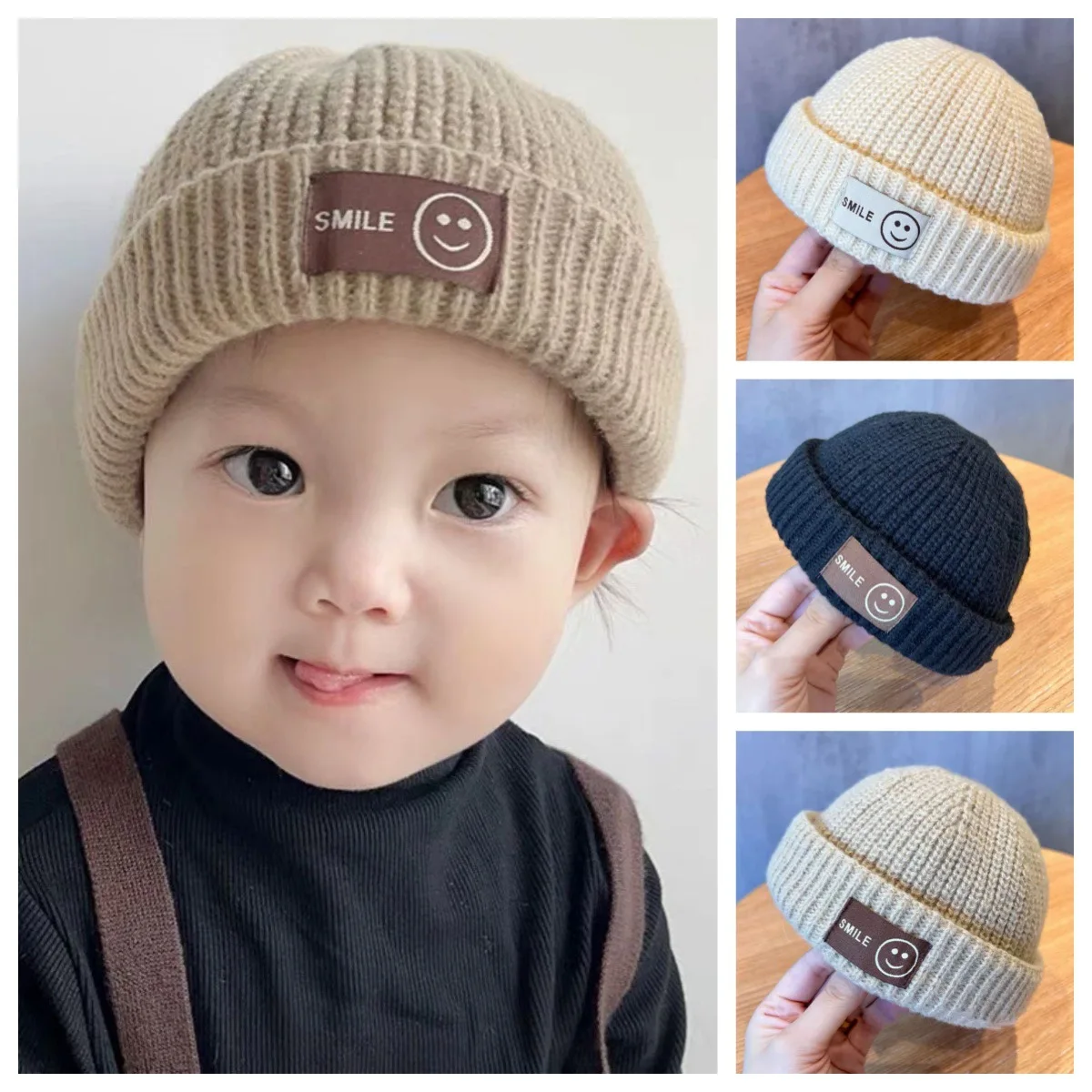 Chapéu de malha versátil infantil, pulôver de bebê, gorro de cabeça quente, estilo coreano, cara sorridente, meninos, meninas, p $2.84