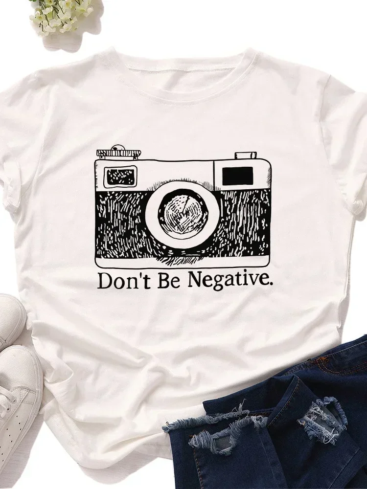 Camiseta con estampado gráfico de cámara Dont Be Negative camiseta informal de manga corta Harajuku para mujer ropa de calle $8.29