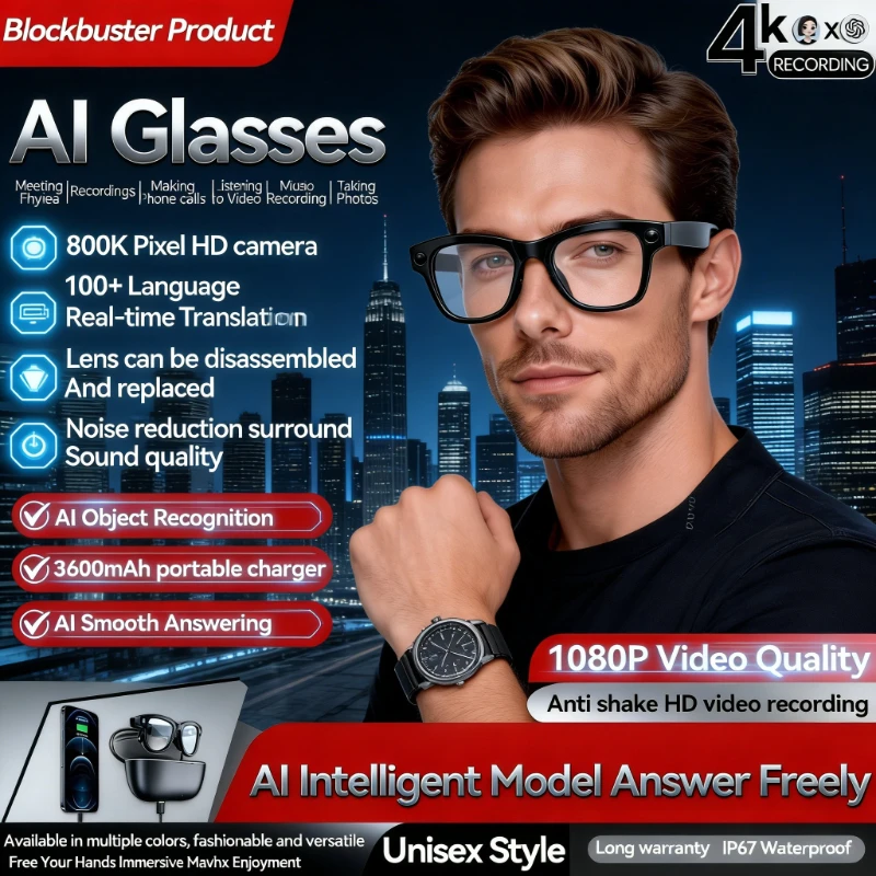 2026 New Study Travel AI Smart Glasses 800W Pixel Camera 4k HD Video Recording Take Photo AI Chat Music Call Translation glasses $92.22