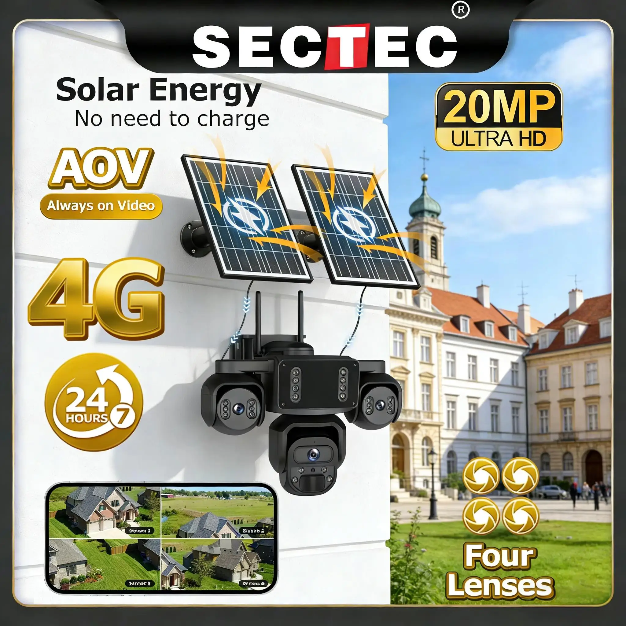 Sectec 20MP Solar Camera AOV 4G SIM Four Screen WIFI Wireless Outdoor Security PTZ Camera 7/24 Hour Video Recording OKAM Pro APP $77.57