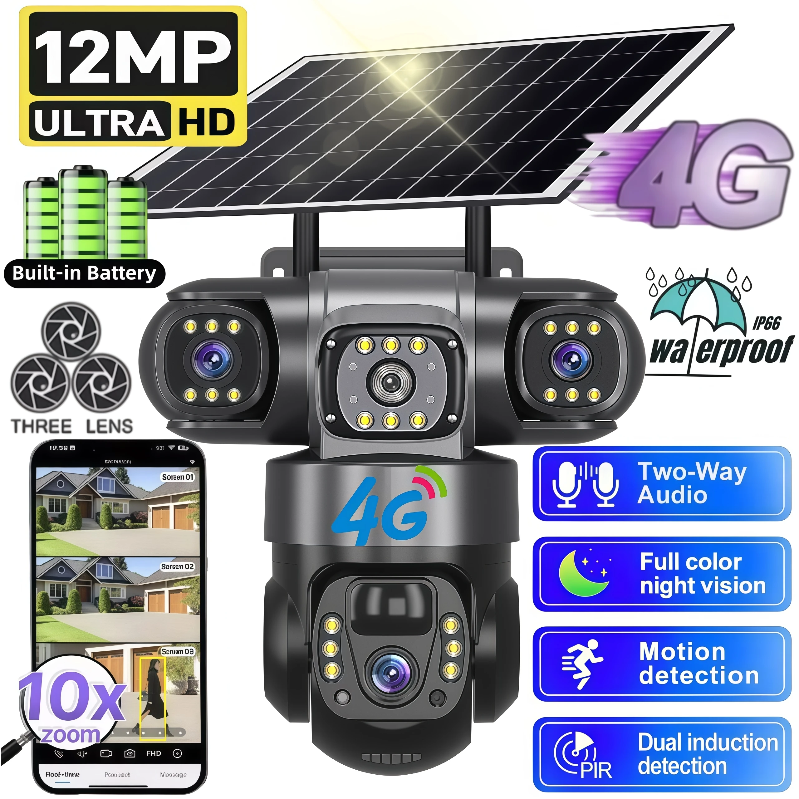 Solar 4G Camera With Sim Card 12MP 6K Three Lens Monitor Night Vision Security Protection PTZ Video Surveillance security camera $67.58