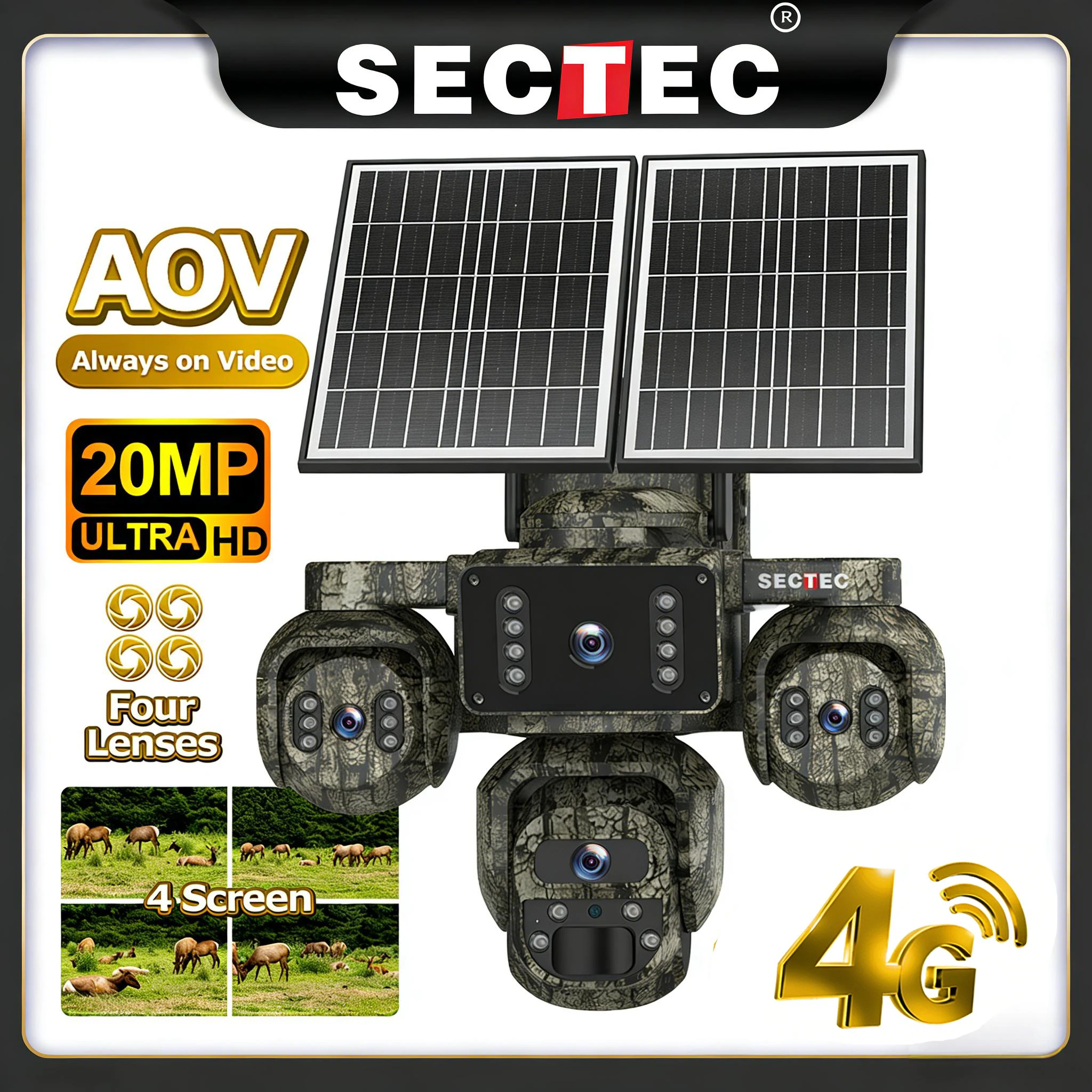 Sectec 20MP 4G SIM Solar Camera AOV Camouflage 4 Lens Outdoor Security Camera 7/24 Hour Video Recording 20100mAh OKAM Pro App $90.06