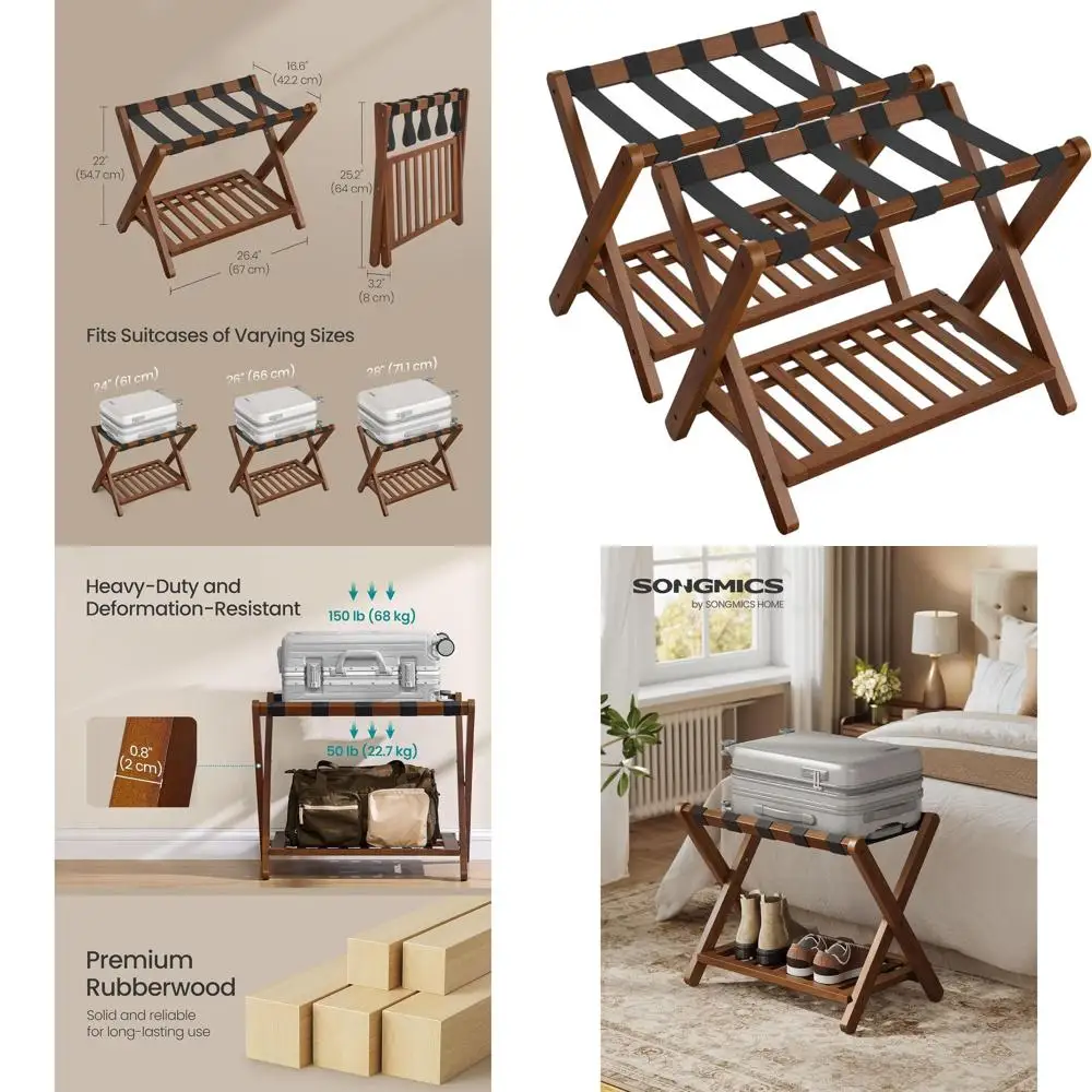 Double Foldable Solid Wood Luggage Stands with Storage, Easy Setup, Ideal for Hotel Rooms and Bedrooms in Coffee Brown $178.02