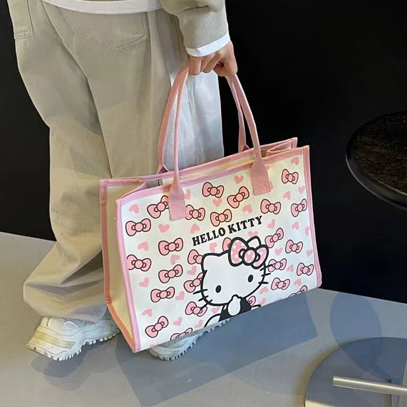 Sanrio Hello Kitty Hand-held Shopping Bag Canvas Tote Bag Cartoon Kitty Cat Large Capacity Mommy Bag Commute Shoulder Bags $7.33