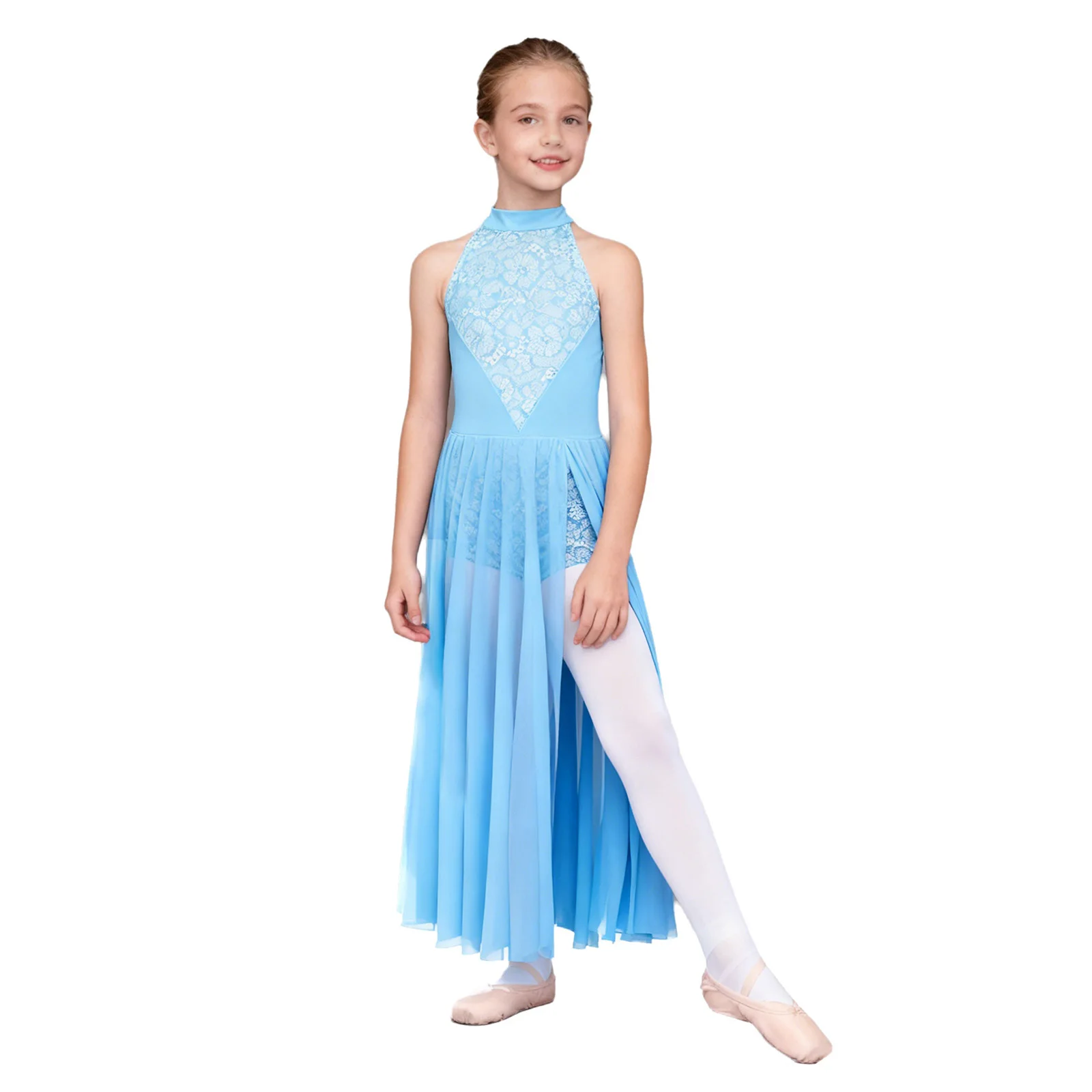 Kids Girls Lyrical Dance Dress Leotard Figure Skating Modern Dance Dress Asymmetric Split Mesh Overlay Dance Performance Costume $15.44