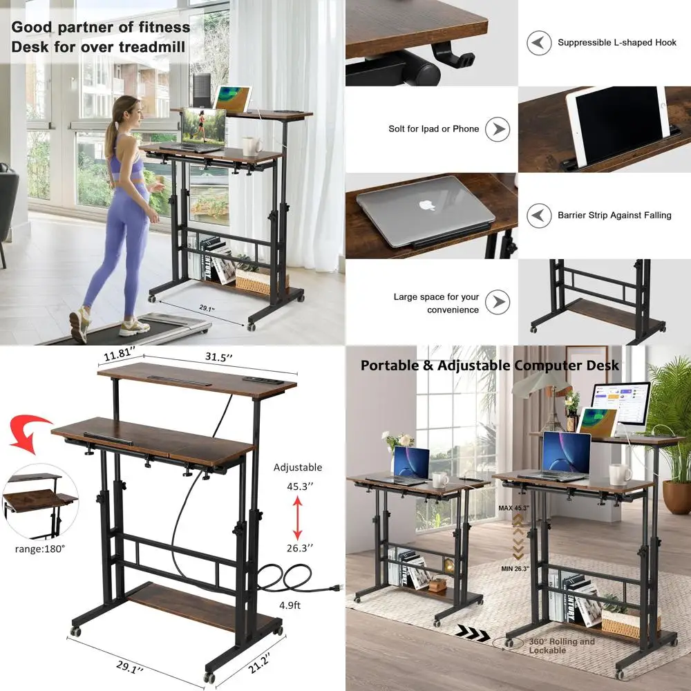 Adjustable Height Rolling Stand Up Desk, Mobile Laptop Table with Charging Port, Portable Rustic Brown Desk on Wheels $130.95
