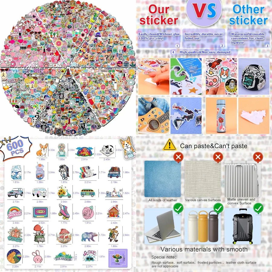 600 PCS Cute Colorful Waterproof Vinyl Art Stickers Pack for Water Bottles Skateboards Notebooks and Laptops Ideal Decal Decora $16.54