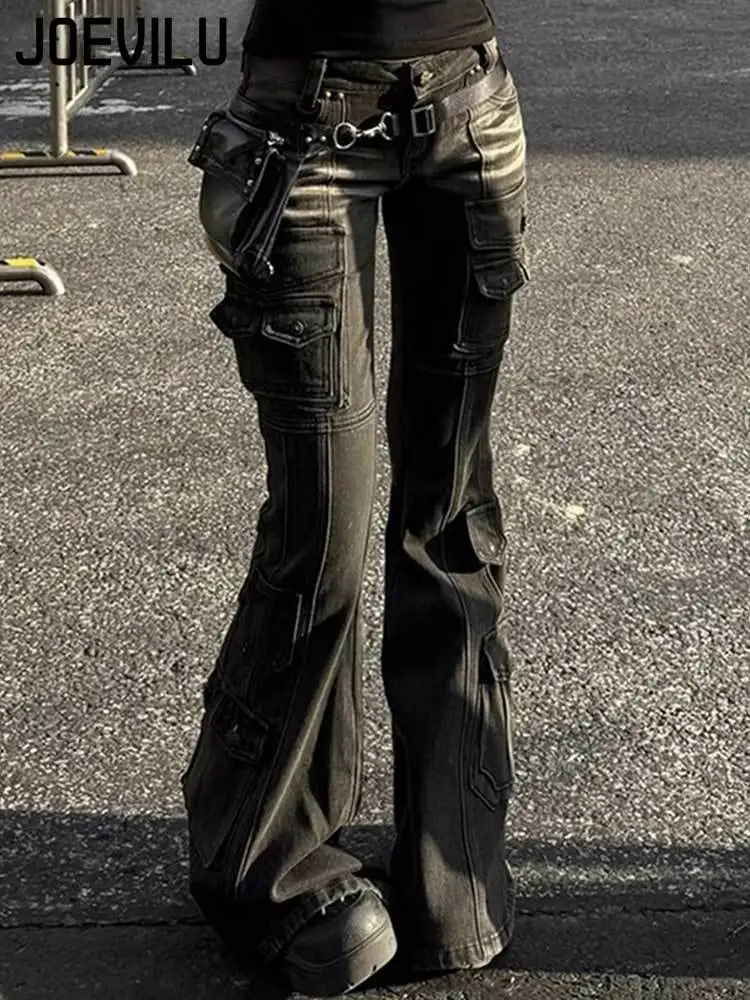 Women's Low Waist Cargo Jeans Black Washed 2000s Y2K Retro Distressed Whiskers Multi-Pocket Bootcut Micro Flare Pants Grunge New $30.67