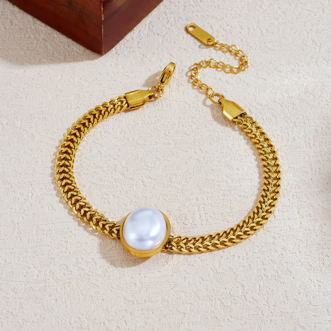 Stainless Steel Oval Shaped Imitation Of Pearl Golden Wide Woven Bracelet Lady Trend Classic Hand Chain Jewelry $3.65