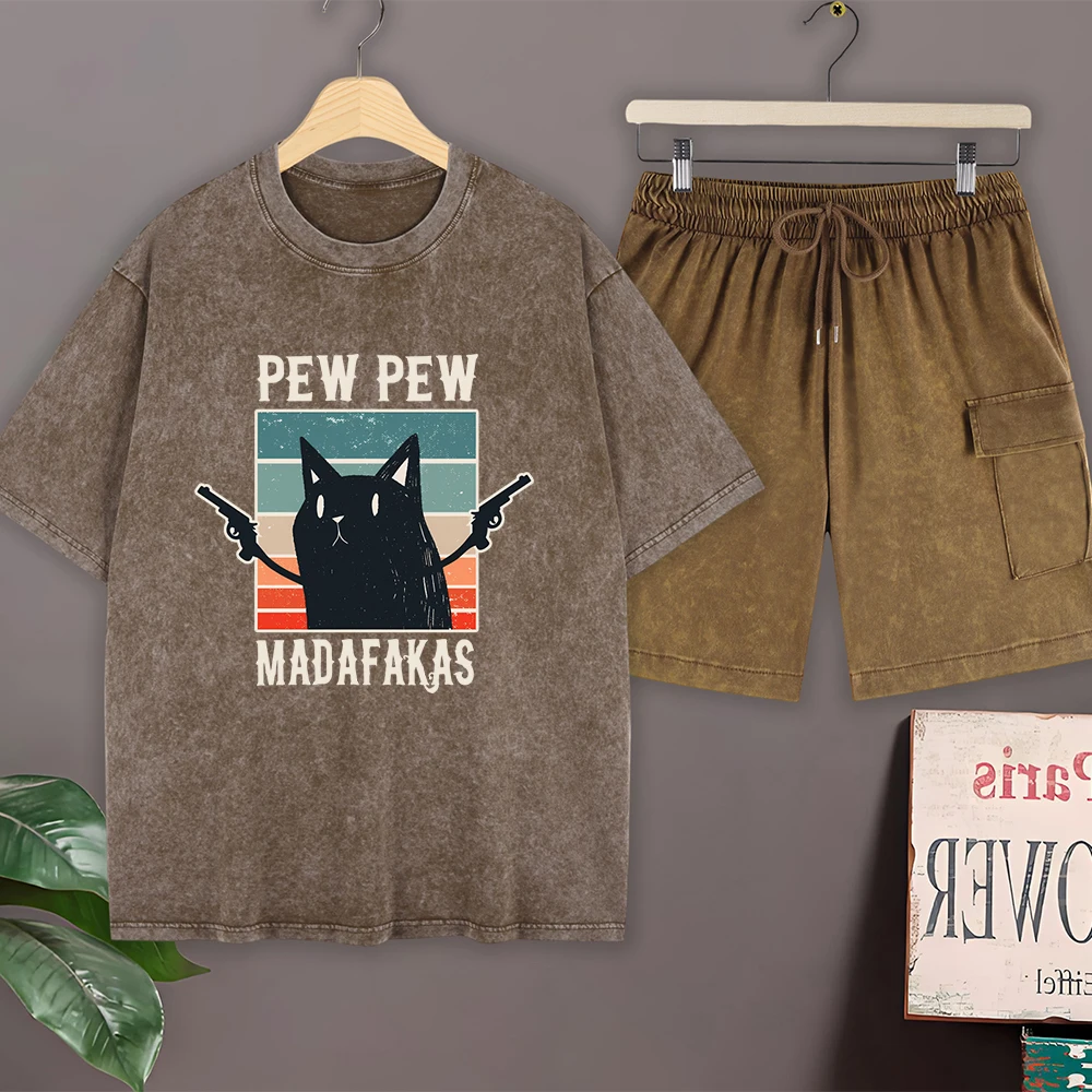Pew Pew Madafaks Cute Funny Cotton Washed T-Shirts Set Mens Summer Short Sleeve Tops Cargo Shorts O-Neck Oversize T Shirt Pants $23.63