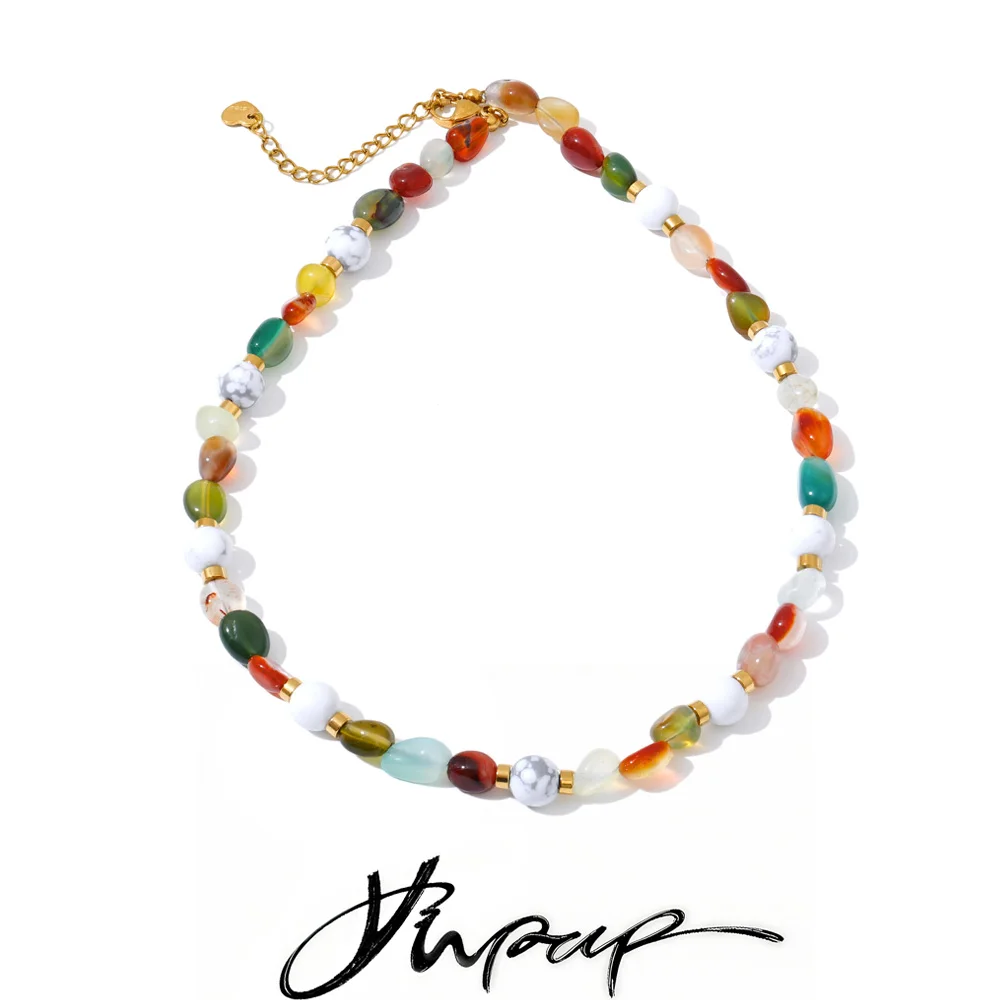 Yhpup Exquisite Colorful Natural Stone Chain Handmade Necklace Water Resistant Stainless Steel Trending Jewelry Gift $6.13
