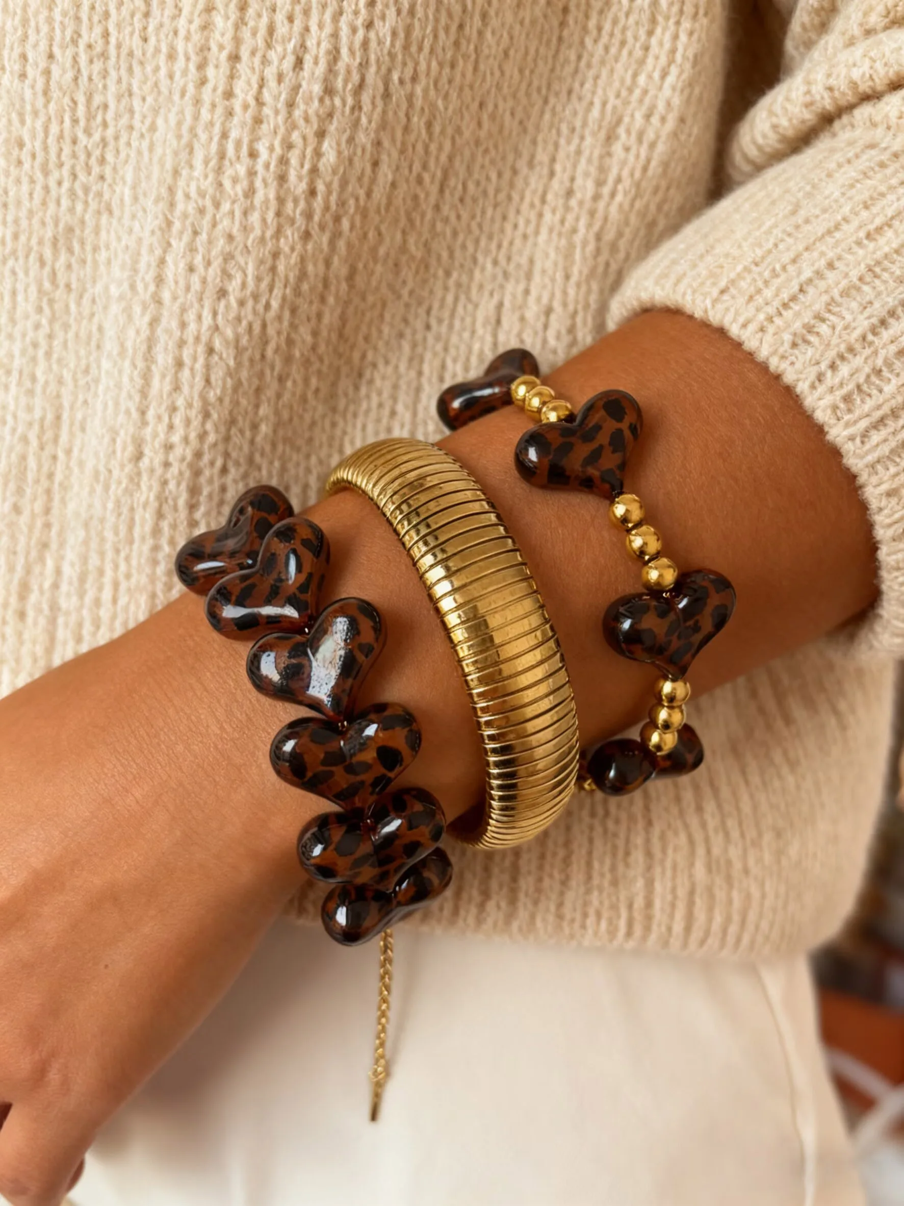 Peri'sbox Heart Shaped Resin Leopard Print Pattern Bracelet Stainless Steel Gold Bangle Women's Scheming New Retro Trend Jewelry $3.81