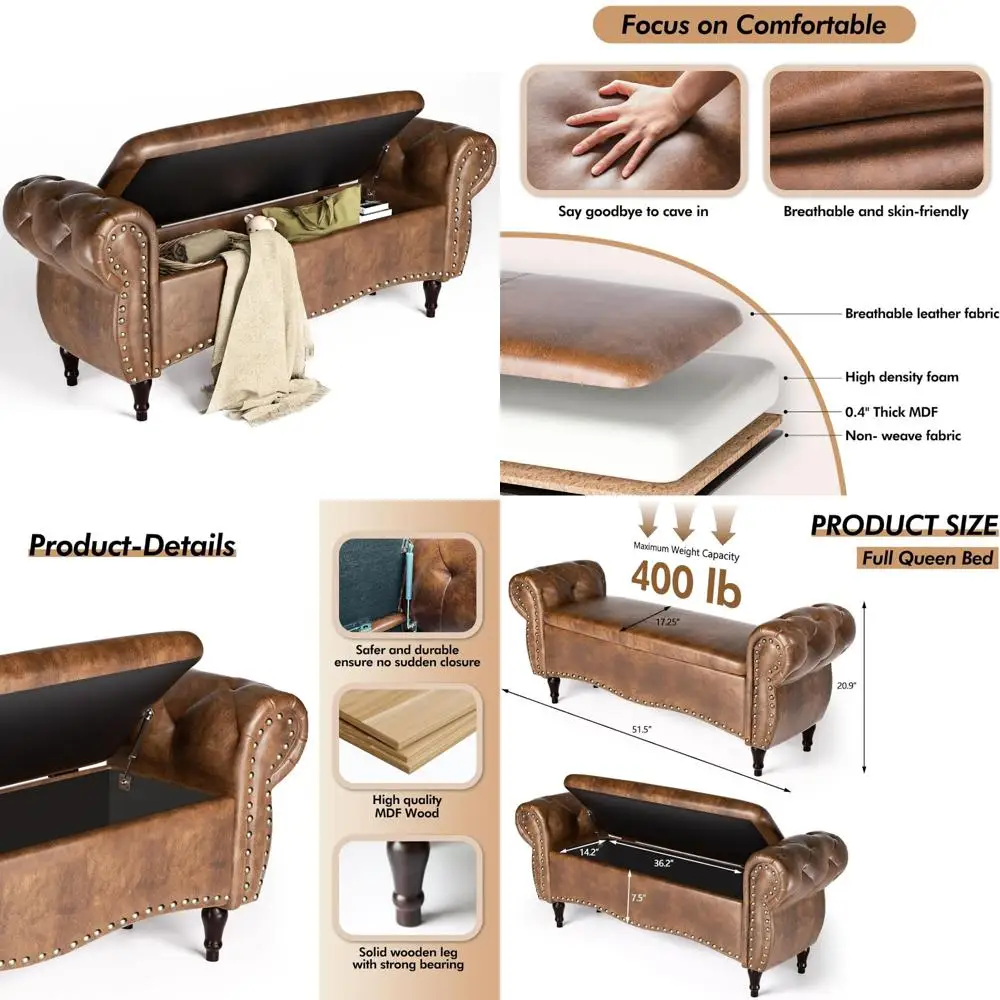 Storage Ottoman Bench, 53 Length Upholstered Bench & Ottoman with Safety Hinge, Tufted End of Bed Storage Benches with Rolled Ar $245.56