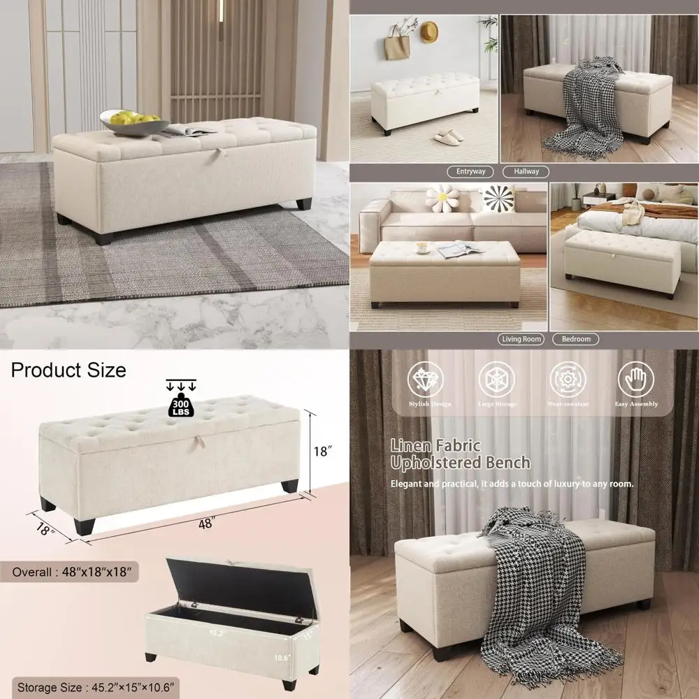 Upholstered Storage Ottoman Bench 48, Hinged Lid, End of Bed Seating, Living Room & Bedroom Furniture $84.95