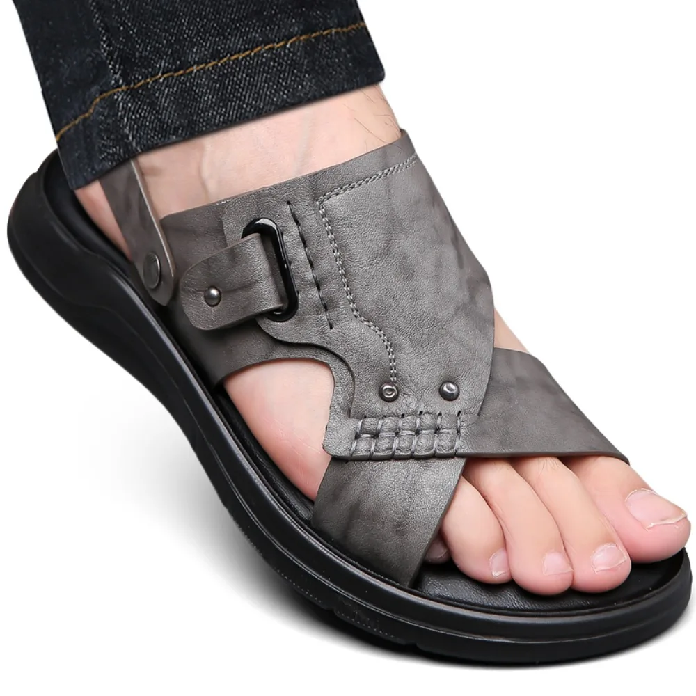Top Layer Cow Leather Slippers For Men Soft Bottom Anti-Slip Summer Outer Wear Slippers Two-Use Business Beach Shoes $36.07