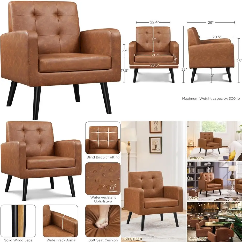 Mid-Century Modern Accent Chair, PU Leather Upholstered Living Room Furniture, Cozy Button Tufted Armchair with Wood Legs $143.51