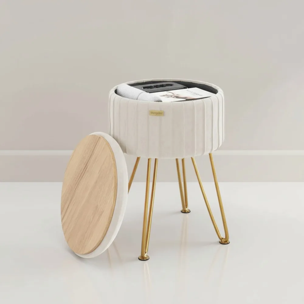 Round Velvet Storage Ottoman Foot Stool, Cream Pleated Upholstery with Dual-Sided Lid for Living Room Bedroom Vanity $43.15
