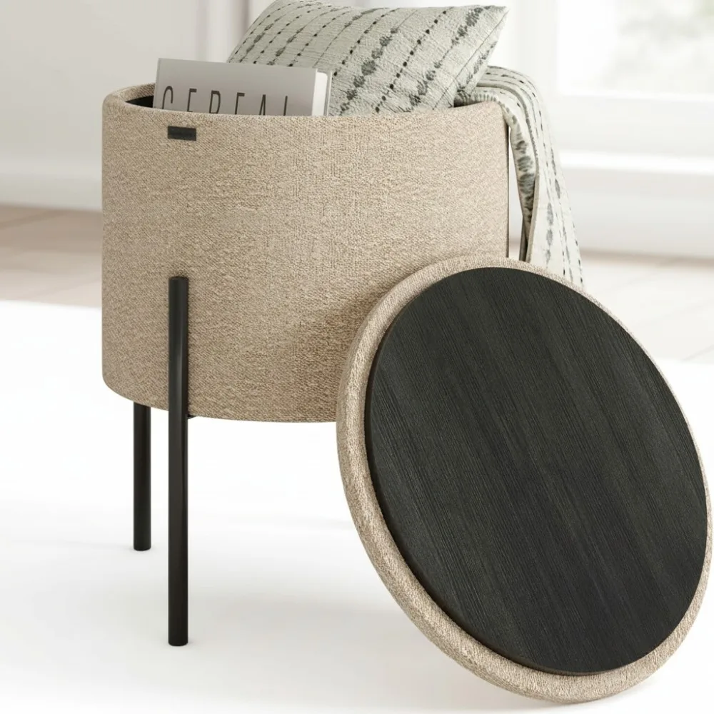 Round Storage Ottoman with Boucle Upholstery, Dual-Sided Lid Foot Stool for Living Room Bedroom, Beige $79.10