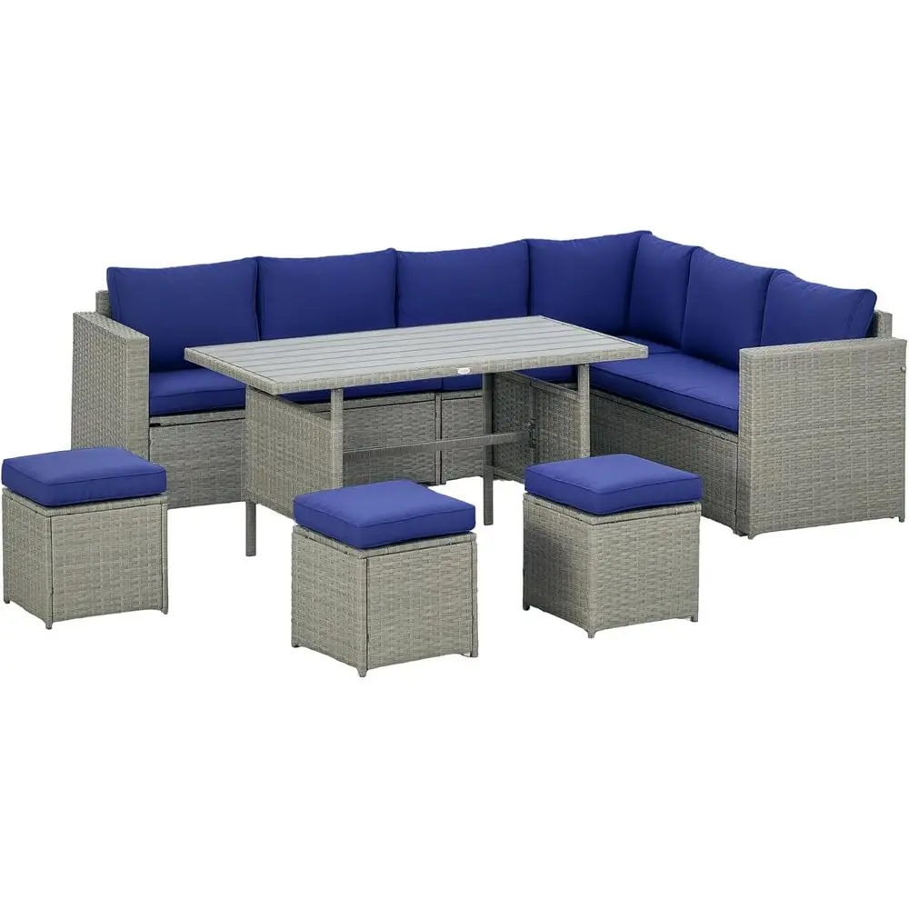 7-Piece L-Shaped Blue Outdoor Patio Furniture Set with Dining Table, Chairs, Storage Sofa, Ottomans, and Cushions $790.69