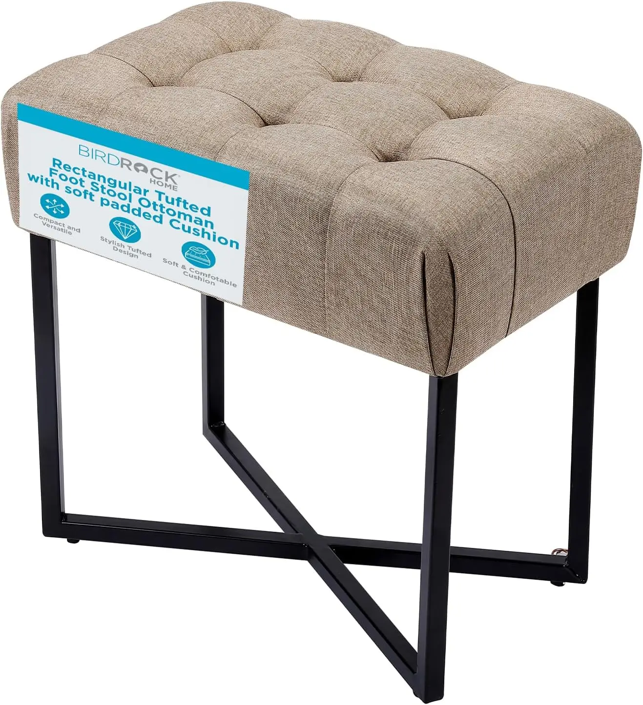 Rectangular Tufted Foot Stool Ottoman, Beige with Black Metal Legs - Soft Padded Cushion for Bedroom, Living Room, Bathroom $162.29