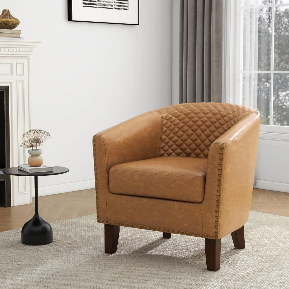 Faux Leather Barrel Accent Chair, Living Room Club Arm Chairs Modern Round Armchair Comfy Upholstered Single Sofa Reading Seat, $120.14