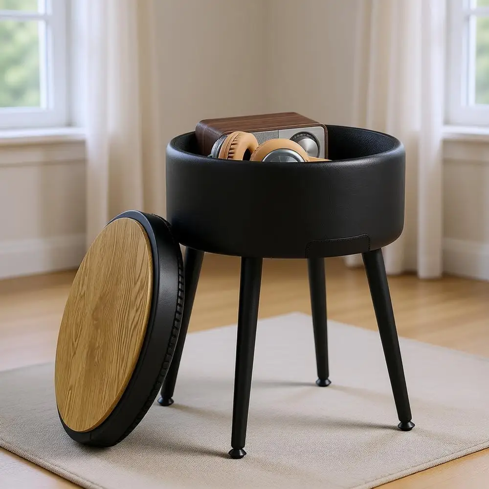 Mid-Century Modern Storage Ottoman, Vanity Chair Stool, Synthetic Leather with Stitching, Round Seat, Steel Legs, Supports 330 l $43.40