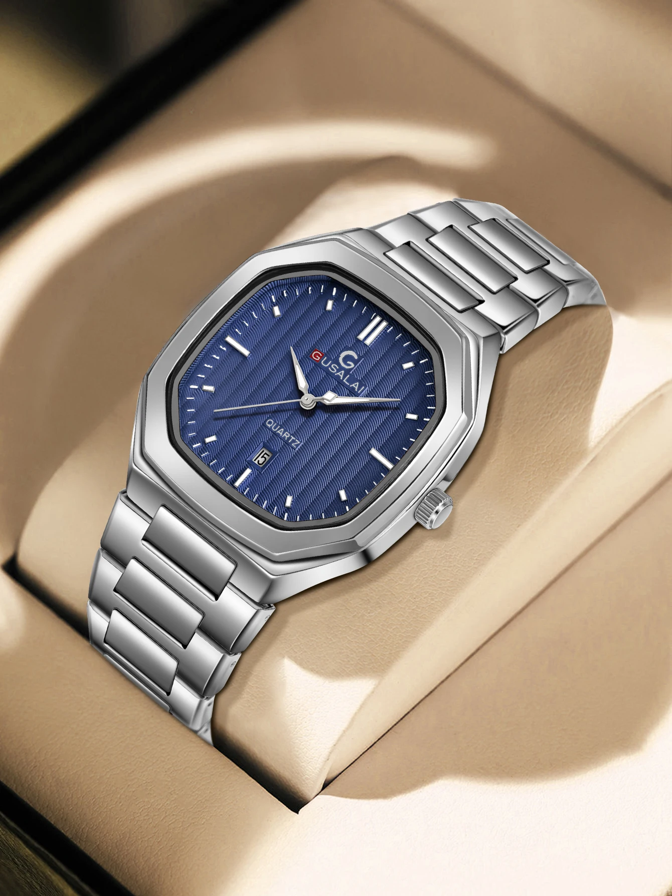 Men's stainless steel strap quartz watch with calendar, luxury hexagonal wristwatch, Christmas gift for boys $8.42