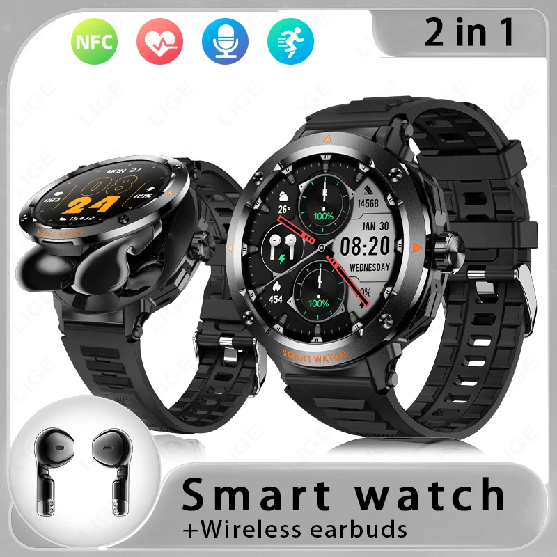LIGE Smart Watch Men 2-in-1 TWS Earphone Bluetooth Call Wireless Music Play Headphone Sports Fitness Tracker NFC Smartwatch 2025 $33.86