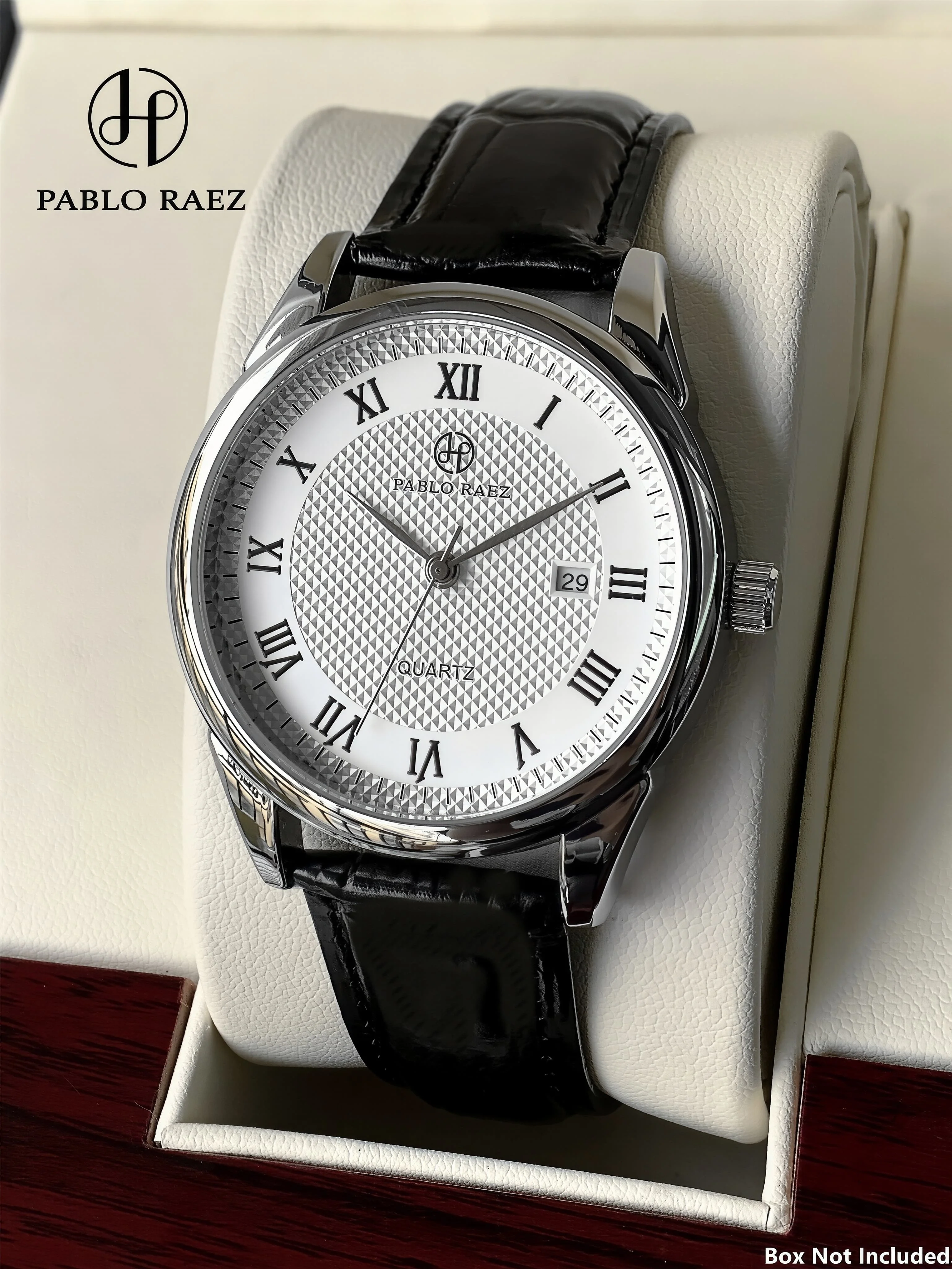 PABLO RAEZ Luxury Quartz Men's Watch Waterproof Calendar Leather Strap Built in Battery Roman Scale Men's Watch Birthday Gift $14.34