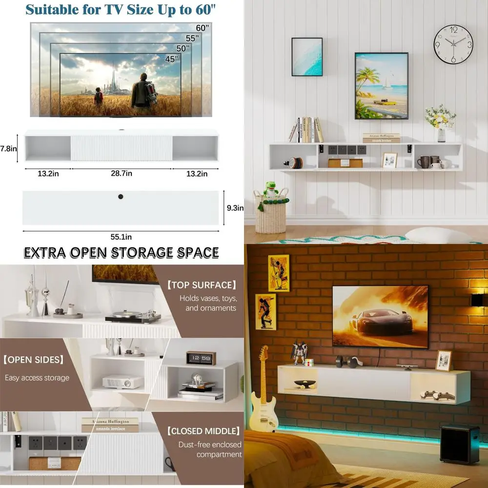 55 Inch White Floating TV Stand with LED Lights - Wall-Mounted Entertainment Center for Bedroom and Living Room Storage $98.55