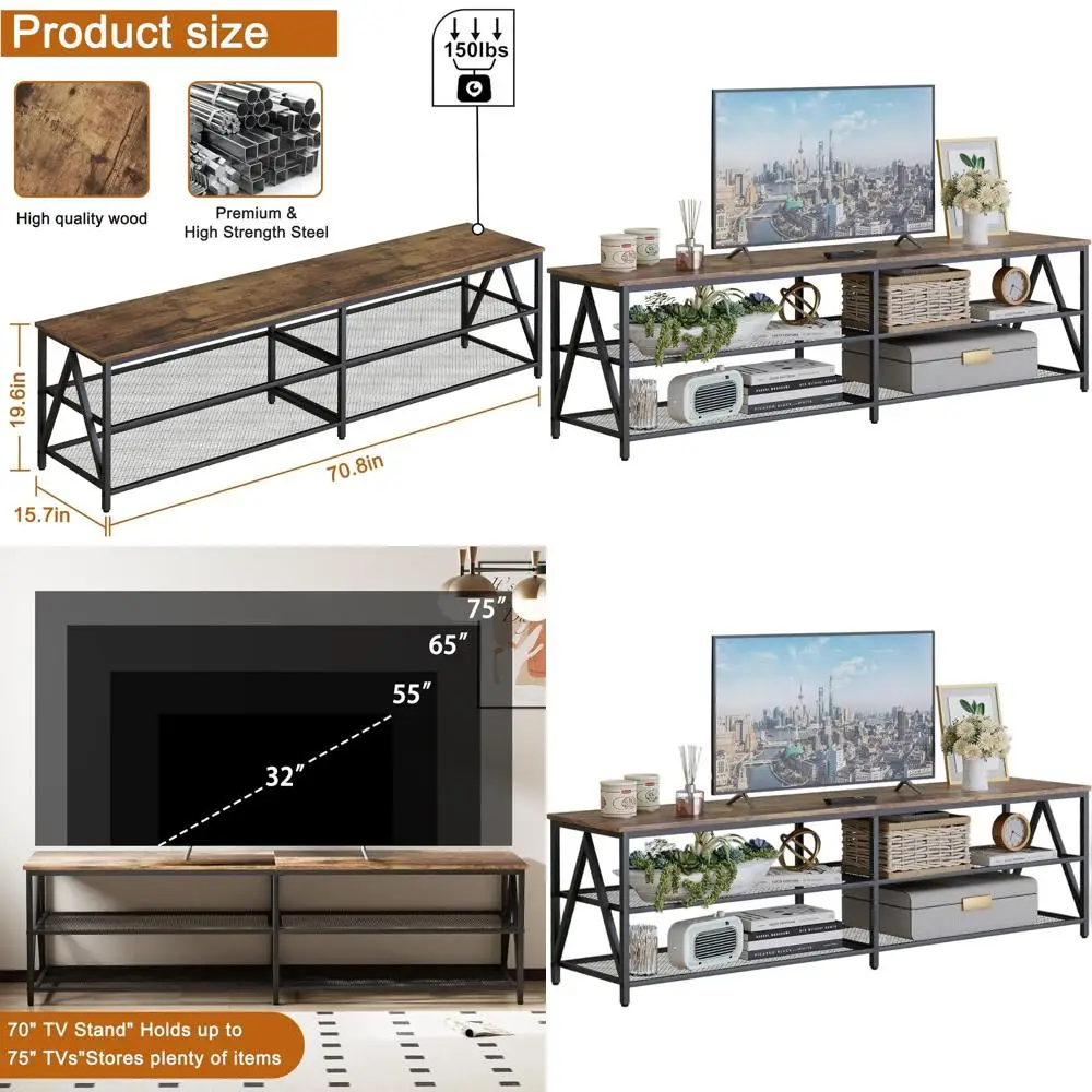 Industrial 70 Long TV Stand with 3-Tier Shelves for 75 TVs, Entertainment Center for Living Room and Bedroom in Brown $99.64