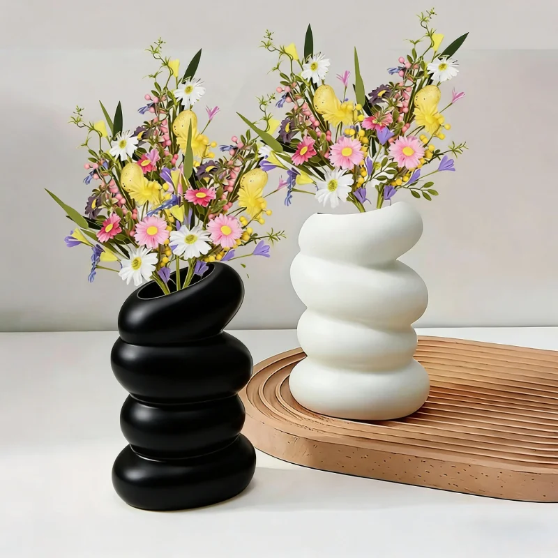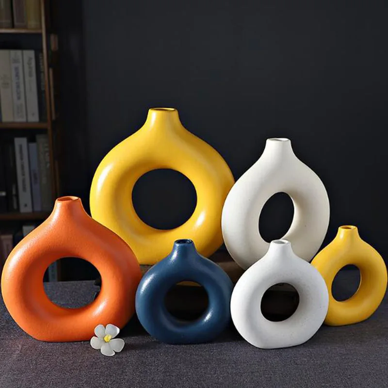 Porcelain Doughnut Vase Hotel Living Room Dry Flower Arrangement Jardiniere Plant Pot Gardening Art Home Decor $11.88