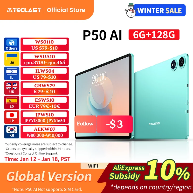Android 15 Teclast P50 AI Tablets 11" 90Hz Screen AllWinner A733-AI Octa-Core 6GB 128GB LPDDR5 Wifi-6 7000mAh Battery AI Tabs $95.79