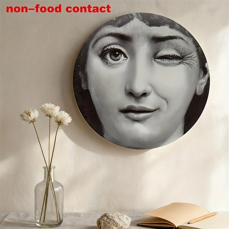 1pc Modern Ceramic Decorative Plate with Female Face Portrait - Round Black & White Photo Display Plate for Wall or Tabletop, $18.95