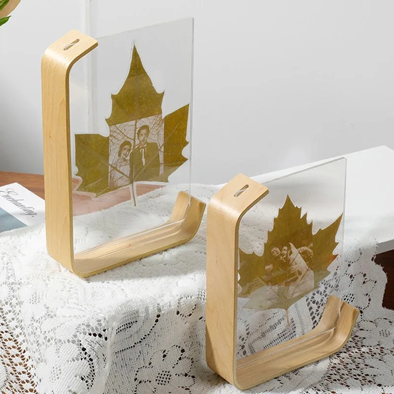 L-Shaped Leaf Carving Double-Sided Acrylic Photo Frame Creative Display Stand Solid Wood Tabletop Ornament Plant Specimen $7.86