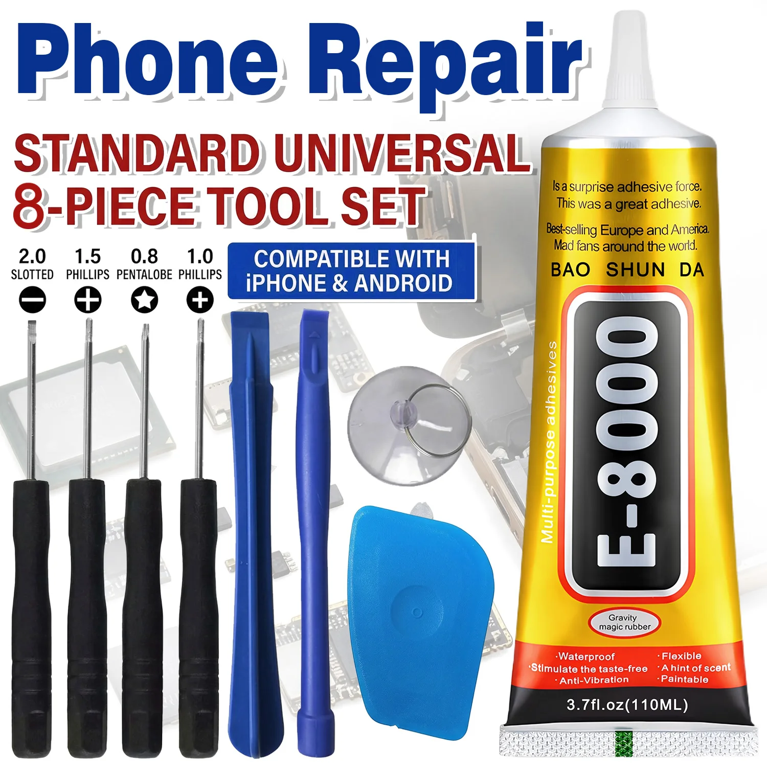8 in 1 Mobile Phone Repair Tools Disassemble Repair Kit for Android iPhone Screwdriver Combination Skid Multi Function Disassembly Set With E-8000 Mobile Phone Screen High-Strength Waterproof Adhesive. $4.46