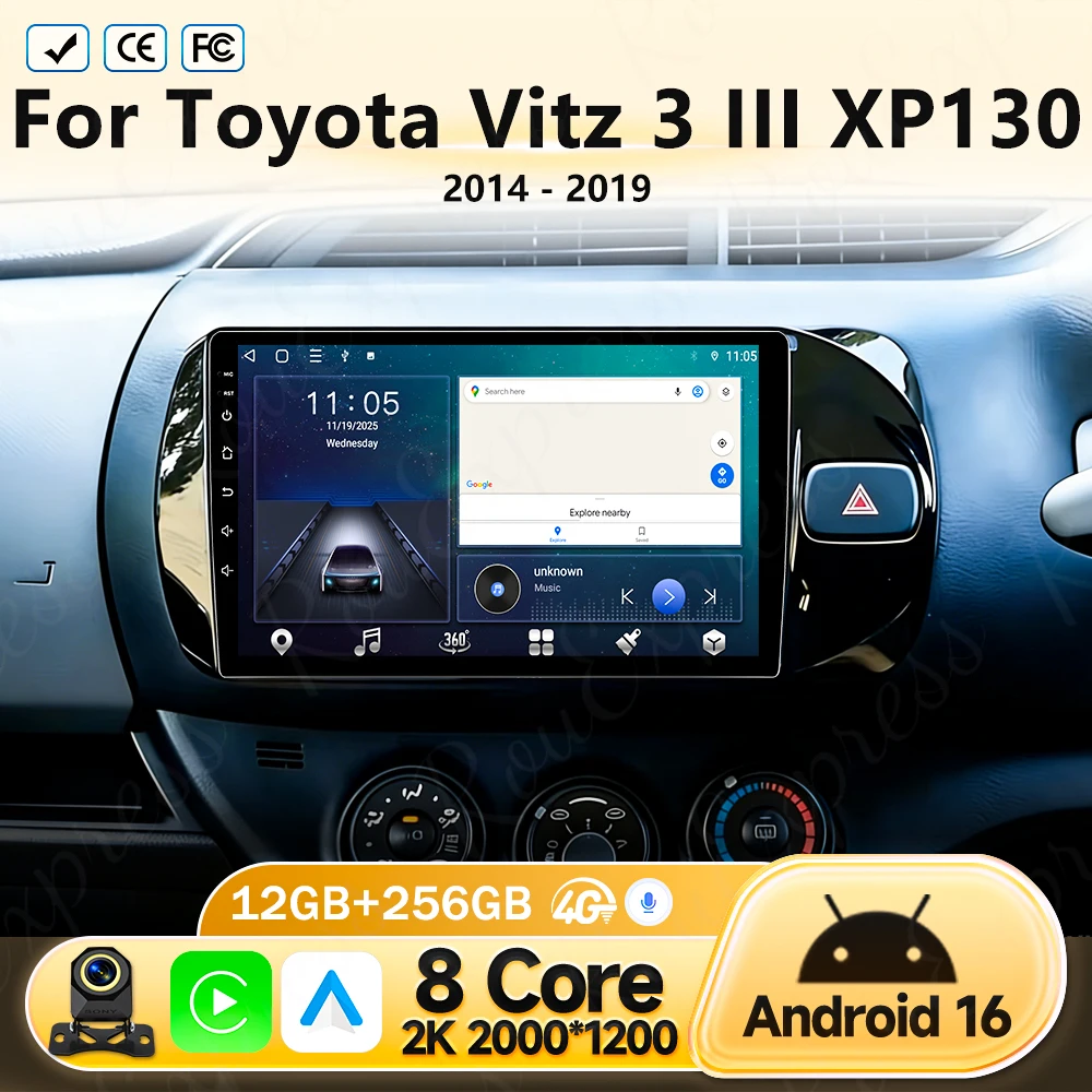 Android 16 Carplay Auto 2K Screen Car Radio Multimedia Player For Toyota Vitz 3 III XP130 2014 - 2019 Autoradio GPS 4G WIFI DVD $68.36